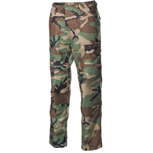 Klasické kalhoty US ARMY (BDU - Battle Dress Uniform - polní bojová uniforma) Dvě kapsy vpředu, dvě kapsy vzadu kryté patkami, dvě velké (vakové) kapsy na bocích stehen rovněž kryté patkami Zapínání rozparku a patek kapes na knoflíky Stahovací pásky pro pohodlnou úpravu šířky v pase, praktické tkaničky na stažení konců nohavic Zpevněné oblasti kolen a sedu zdvojením materiálu Materiál: 65 % polyester, 35 % bavlna Výrobce: MFH, Německo