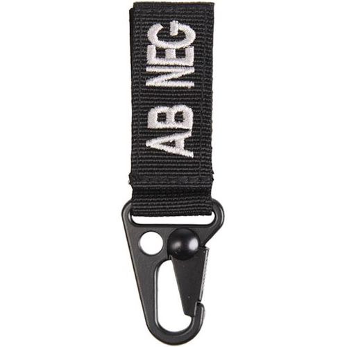 Klíčenka s označením krevní skupiny AB NEG. Snadné zavěšení na poutko, nebo popruh oděvu, batohu, nebo jiné výstroje. Oko klíčenky je spojené stuhovým uzávěrem. Rozměry: 3 x 11 cm Průvlek max.: 5 cm