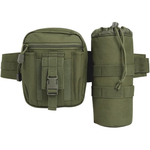 Opasek s ledvinkou a odnímatelným pouzdrem na polní láhev opasek: 4 cm široký, délka nastavitelná, max. 120 cm hmotnost: 290 g zhotoveno ze 100% robustního polyesteru 600D kompatibilní s taktickým systémem MOLLE zapínání plastovou sponou ledvinka: rozměry: 18 cm × 14 cm × 6 cm hlavní úložný prostor zapínaný zipem přední menší úložný prostor zapínaný zipem vnitřní oddíl též zapínaný zipem kvalitní provedení zipů i tahačů přizpůsobitelná přední kapsa na smartphone zapínaná plastovou sponou dvě proháhlé kapsičky na přední části pro uložení psacích potřeb nebo třeba malé svítilny pouzdro na láhev: odnímatelné, možno nosit samostatně na jiném opasku rozměry: 21 cm × 9 cm × 9 cm pro láhve o průměru cca 9 cm (objem 0,5 l - 1 l) hmotnost: 75 g zhotoveno ze 100% robustního polyesteru 600D kompatibilní s taktickým systémem MOLLE uzavíratelné pomocí stahovatelného tkalounu s brzdičkou výrobce: Brandit, Německo kód výrobce: 8062