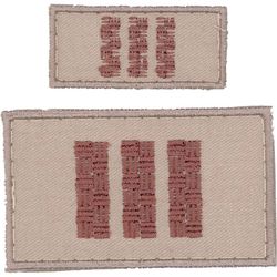 Hodnostní označení Armády České republiky Vyšívané hodnostní označení pro vojenské polní stejnokroje Armády České republiky. Odpovídá Stejnokrojovému výnosu 2012. Nášivky jsou na rubové straně opatřeny stuhovým uzávěrem (suchý zip) pro připevnění na uniformu. Připevnění: stuhovým uzávěrem Rozměry: malá: 45 x 20 mm velká: 68 x 40 mm