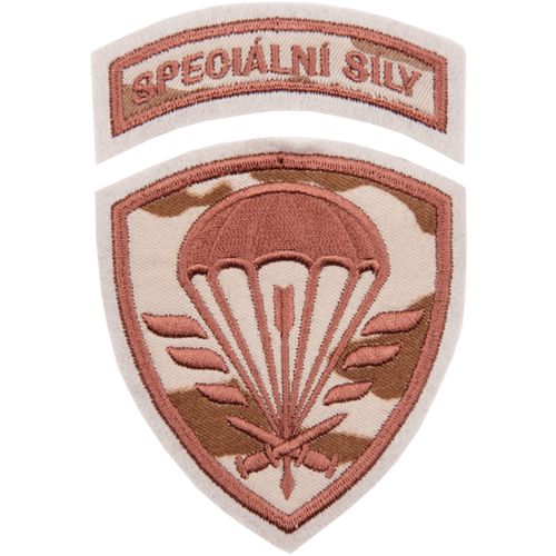 Tvarovaná nášivka s padákem, zkříženými meči a šípem. Samostatný oblouček s nápisem "SPECIÁLNÍ SÍLY" Rozměry: oblouček - 70 x 22 mm znak - 70 x 80 mm